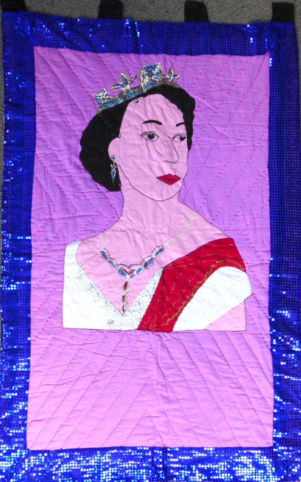 Bust of Queen Elizabeth in a white dress with red sash, necklace and crown on a pink background, dark blue gauze border with glued sequins.